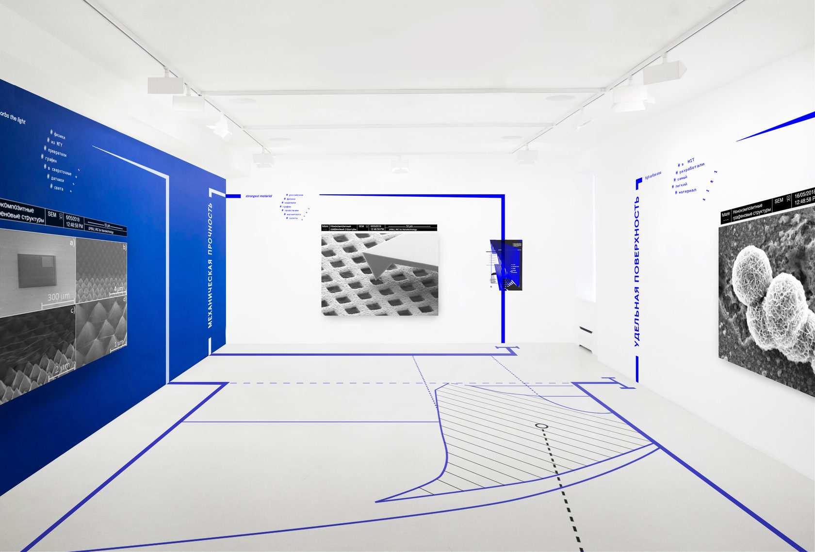 Invisible Aesthetic Exhibition project in augmented reality A joint project with SPBU Research Park The project sought to find an aesthetic form for scientific research. The exhibition "Aesthetic of Science" was centered on "data maps" of Graphene, the material of the future. They were presented as photographs taken in international laboratories with the microscope (SEM, TEM, and AFM). Graphene is a single atom of carbon. It is everywhere, and it is even part of the air we breathe in. Experiments conducted in the laboratories all over the world show that unique properties of this material can in the near future lead us to massive progress in almost every crucial area of our everyday life, from technology to health care. The information was broken into thematic categories. Every category was supported by virtual and material information basis. For the virtual part, there were 3D sculptures and words for the services like OK Google or Siri. The material part consisted of photos and posters carrying infographics. |